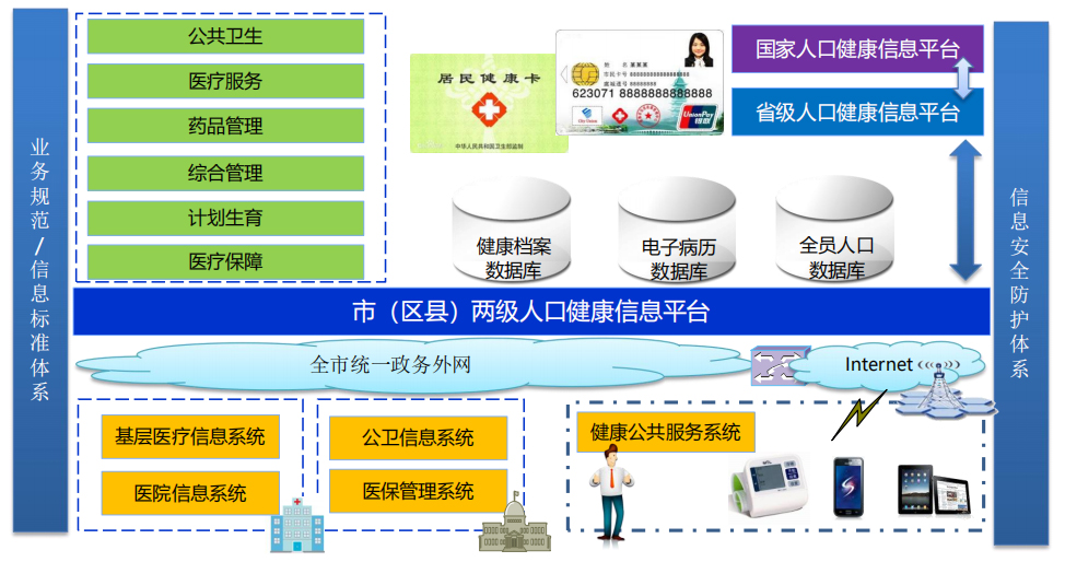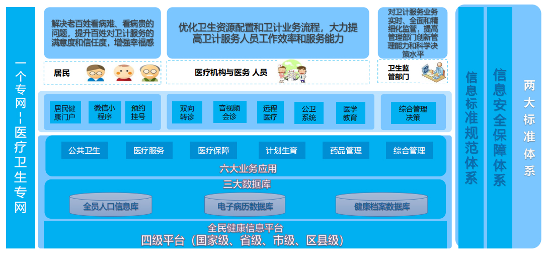 全面建成互联互通的国家、省、市、县四级人口健康信息平台,实现公共卫生、计划生育、医疗服务、医疗保障、药 品供应、综合管理等六大业务应用系统的互联互通和业务协同。