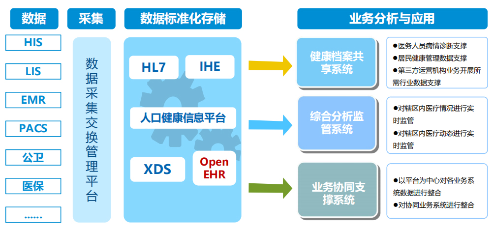 根据国家卫健委颁发制定的标准,结合行业内各个业务系统厂商实际应用情况,制定平台与各业务系统数据交换标准,实现区域内医疗数据的交换和共享。