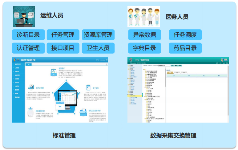 数据采集交换调度、医疗卫生术语字典对照、数据标准化、 数据安全管理。