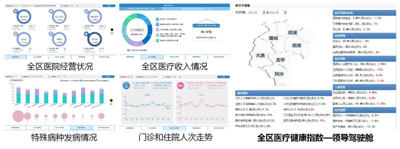 汇集区域内各级医疗机构的运营信息,通过数据分析系统对日常监测数据进行智能分析,向领导驾驶舱提供实时的医疗资源可视化日常监测,为监管部门即时掌握全区医疗机构运营提供数据支撑。