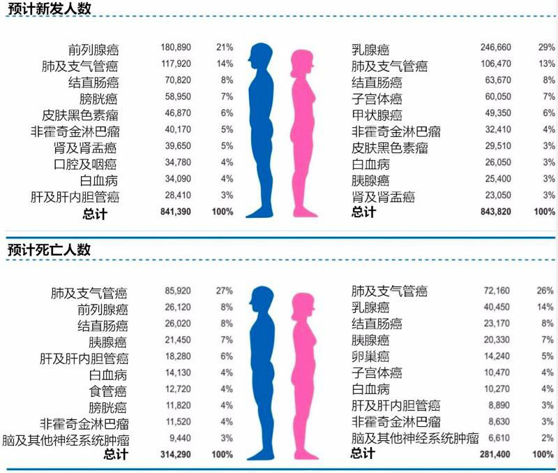 十大易发癌症新发人数及死亡人数预测(按性别分)