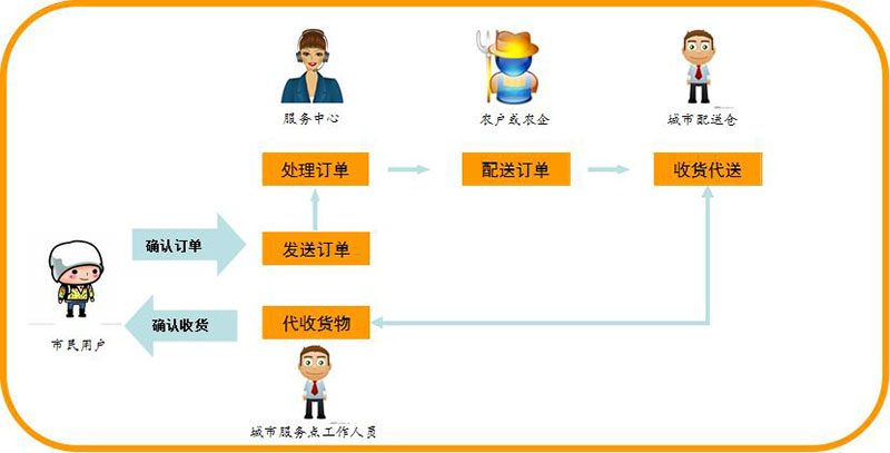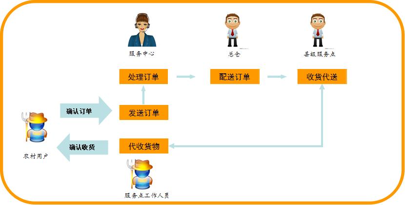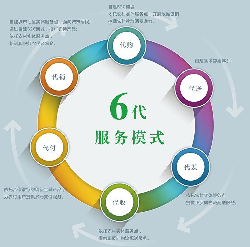 电商依托于线下的三农服务网点,在搭建电商服务体系的同时提供代购、代送、代发、代收、代付、代销的增值服务,从而降低人们生活成本,提高生活质量。