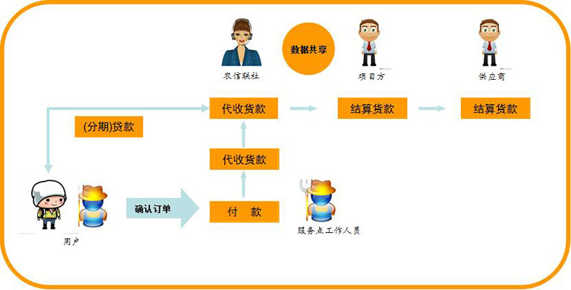 在国家鼓励三农服务进行“互联网+”多元化创新的政策背景下,在多个金融机构通过各种手段不断渗透农村金融服务市场的竞争态势下,电商精准选择与区域内拥有成熟便民金融服务点的优质金融机构深度合作,共同研讨、论证、开展“互联网+普惠金融”工程,并作为其项目承接单位,以“商城”为项目承载平台,通过增加村级便民金融服务点的服务内容,进一步完善合作伙伴支农惠农的服务手段,建设集“代购、代送、代发、代销、代收、代付”于一体的农村生态服务体系,深挖便民金融服务点附加价值,最终实现金融机构在三农服务与普惠金融工作中不可替代的作用。