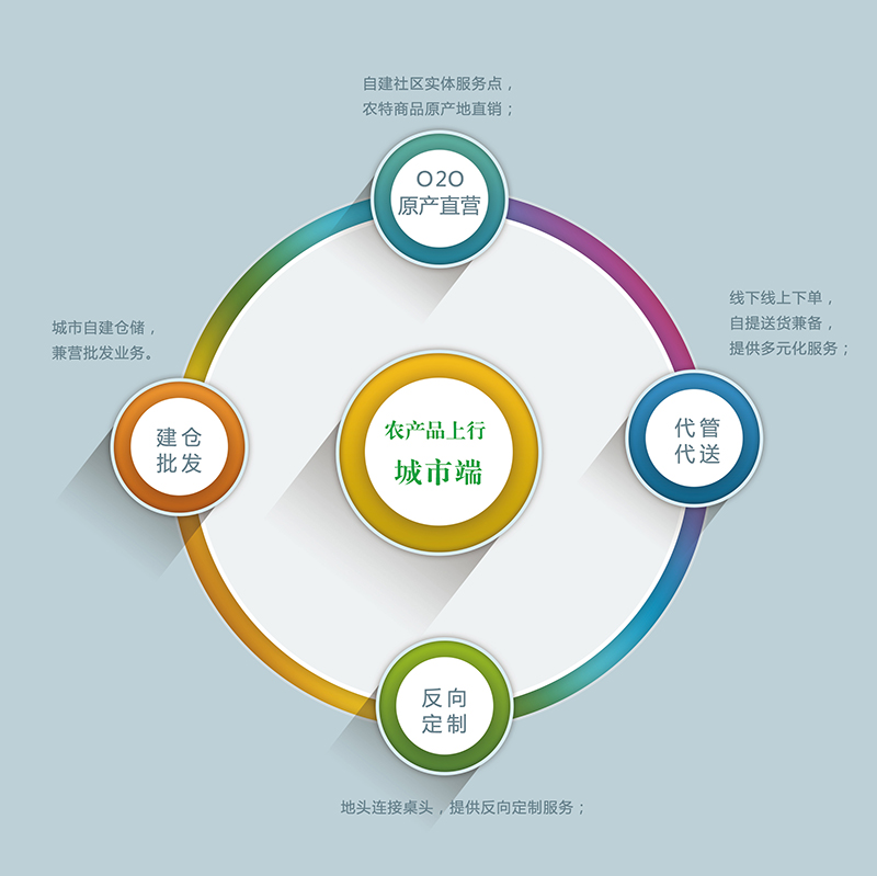 建设以线上线下为一体的O2O模式电商平台,自建县域和社区物流配送体系,致力于改善地县、乡镇、村落的购物环境,降低人们生活成本,提高生活质量;优化农产品流通环节,增加农民收益,提高农业资源配资效率,最终搭建优质工业产品下行进村与优质农产品上行至社区的双向流通管道。