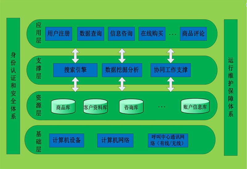 支撑层 提供搜索服务,对商品销售、评论等根据若干年保存的数据资源 进行挖掘分析,以获得平台发展、支持、服务的可靠的决策依据,为 客户、平台管理者提供统一消息、邮件服务、文档管理等协同工作支 撑的功能。