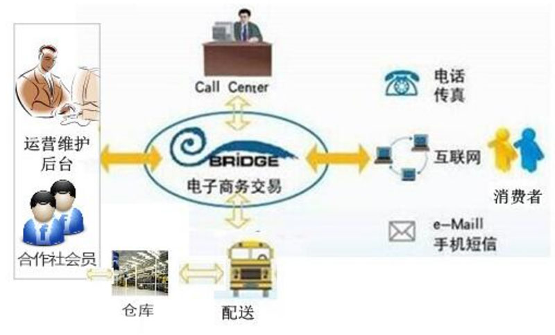 3.2 业务架构 如下图 3.2-1 所示,合作社会员将商品介绍和在线货量等信息在电子商务交易平台上发布,消费者通过互联网访问交易平台,在找到满意的产品后进行在线订购,通过网络银行支付,订单信息发送到物流 商系统,完成货物配送。消费者也可以通过呼叫中心与服务人员交流 咨询,平台还可以通过电子邮件,手机短信等方式和消费者联系。