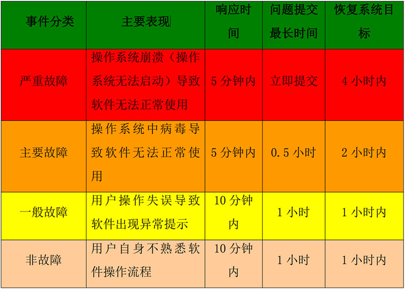 我公司对提供的软件系统进行技术支持及产品维护,承诺提供2小时服务响应;提供 7 天×24 小时电话技术支持服务,6天×8小时 QQ 在线技术支持服务及远程协助服务,达到技术工程师现场解决问题的效果。免费维护期内买方报修后,在1小时内远程电话服务支持不能解决问题的,我方保证在12小时内到达现场,24小时内排除故障。由此产生的一切费用均由我公司承担。公司售后服务部在接到用 户软件重大故障报修请求后,将安排专人与用户通过电话具体联系, 并在最短的时间内(不超过 10 分钟)确定故障的技术解决方案。