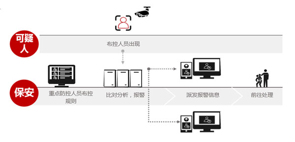 对重点关注人员进行人脸布控,对可疑人员进行 人脸抓拍并告警.重点关注人员,出现在监控区域 内即告警,高度保障校园和社会安全.