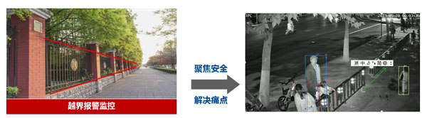 通过AI赋能周界视频监控,实现可疑人员越界分析、昼夜可视、智能态势分析、报警联动等功能。可广泛应用于校园、宿舍周界、危险区域(高楼、人工湖)等场景,实现越界报警监控及预警。