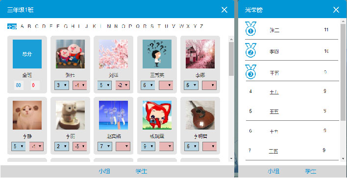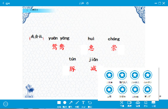 提供多种互动工具,如光荣榜、随机挑人、分组挑人、小组评分、截屏、随写板、计时器、聚光灯、作品观摩、学生答题、发送板书;