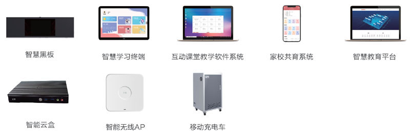 本方案由智慧黑板、智慧学习终端、互动课堂教学软件系统、家校共育系统智慧教育平台智能云盒、智能无线AP、移动充电车组成。