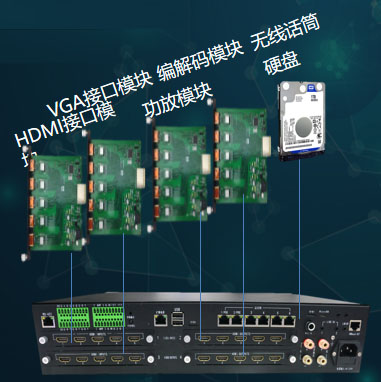 模块化设计;自定义编程;10进10出的混合视频矩阵;HDBASE接口;POE接口;集成2*120W功放;集成音视频编解码;集成硬盘。