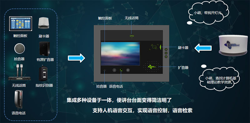 集成多种设备于一体,使讲台台面变得简洁明了;支持人机语音交互,实现语音控制,语音检索。