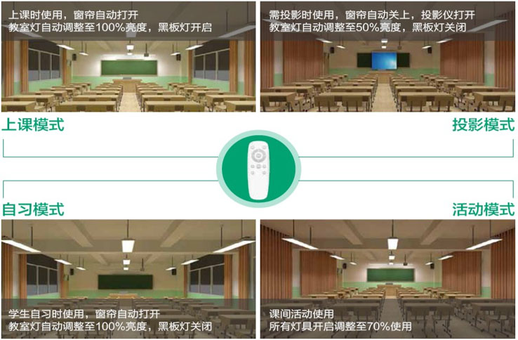 场景模式自定义:系统可定义上课、投影、自习、活动等多种场景模式,一键实现灯光、窗帘、屏幕、设备的联动控制;