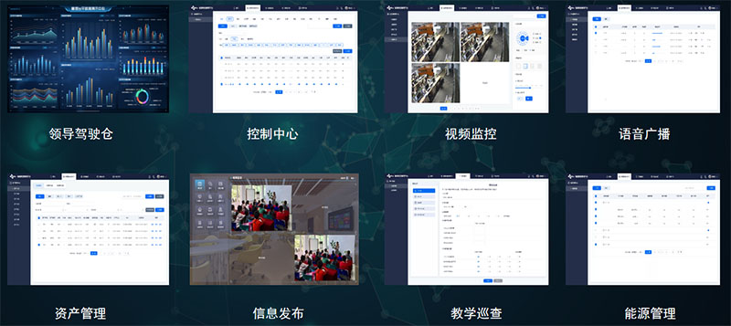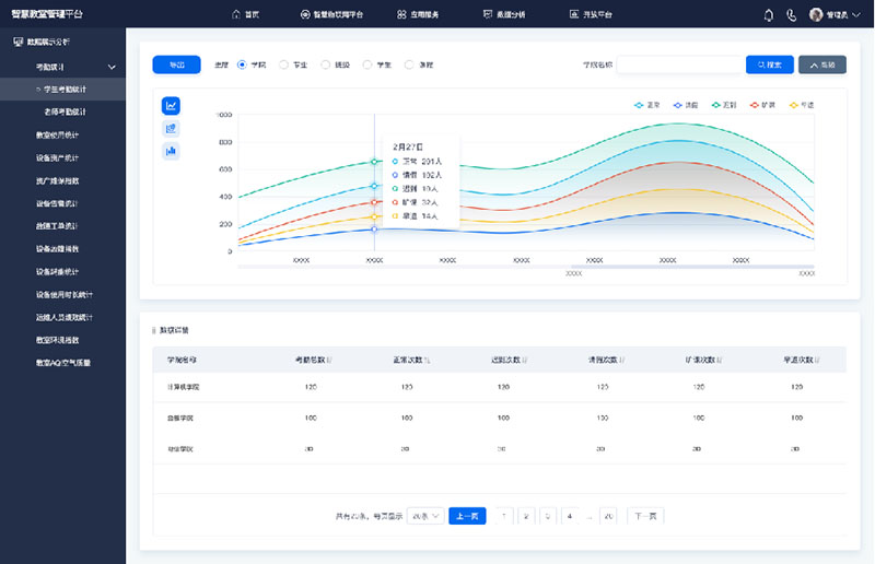 业界最丰富的数据分析:多媒体教室借用、多媒体教室预约、多媒体教室使用率、学生考勤、教师考勤、资产盘点、设备的故障率、设备能耗、工作绩效、投影机灯泡使用时长、教室空气质量曲线图。