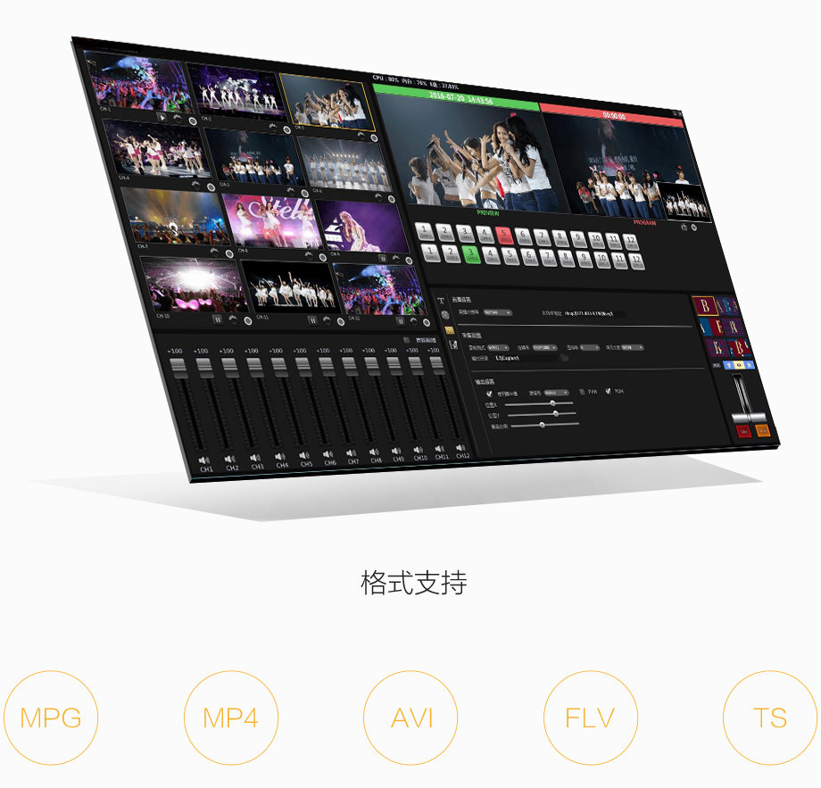 内置实景切换导播系统,代替硬件导播台,实现12路实时导播,可4路实时信号画面配合8路素材画面切换,实时信号向上可拓展12路,集成转场特效,以及增加字幕机的功能直接播出,无需再单独接入字幕机,也可外接配套硬件导播台,满足客户的使用习惯,合成画面和8路素材画面实时录制,活动结束后直接生成视频文件。