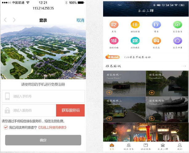 游客通过微信登录WIFI,或者直接输入手机号获取链接,点击进入使用Free-WIFI。在WIFI登录认证界面有景区推广配图,游客可点击前往移动端WAP网。