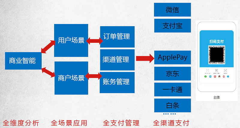 搭建简单、稳定、安全的统一支付平台 , 对各功能处理环节进行串接,通过统一通道网关对不同格式、不同标准的各通道报文进行收发处理。支持微信支付、支付宝、银联、ApplePay、一卡通等支付方式全接入,改善目的地支付环境,同时提高目的地商户收款效率和资金管理水平 。