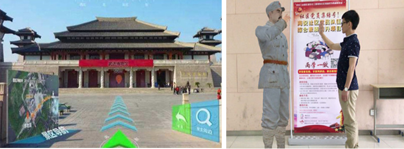 1.智能终端AR应用,对现实场景(景区景点)摄像时,会在画面上叠加导游信息:路线指引、互动讲解、文物修复、互动留念、历史重现等;