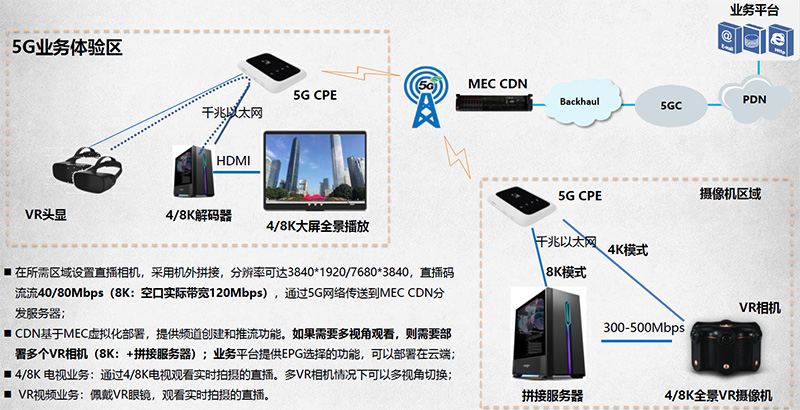 在所需区域设置直播相机,采用机外拼接,分辨率可达3840*1920/7680*3840,直播码流流40/80Mbps(8K:空口实际带宽120Mbps),通过5G网络传送到MEC CDN分发服务器;