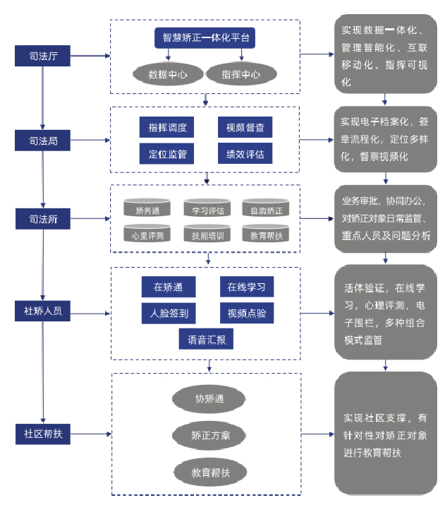以社区矫正数字化、网格化、智慧化发展为主线,充分利用互联网、物联网、大数据、人工智能、区块链等 现代信息技术打造“数据一体化、管理智能化、互联网移动化、指挥可视化”的“智慧矫正一体化管理平台”,为实现社区矫正工作跨越式发展提供有力支撑。