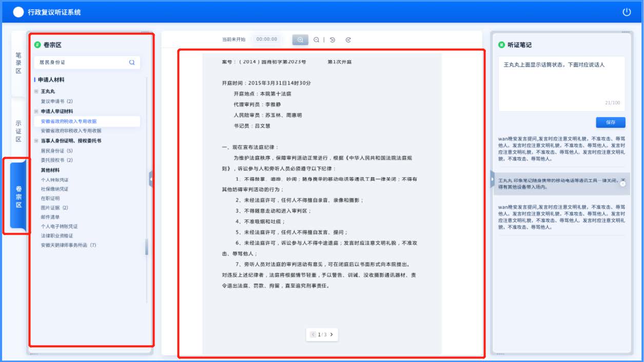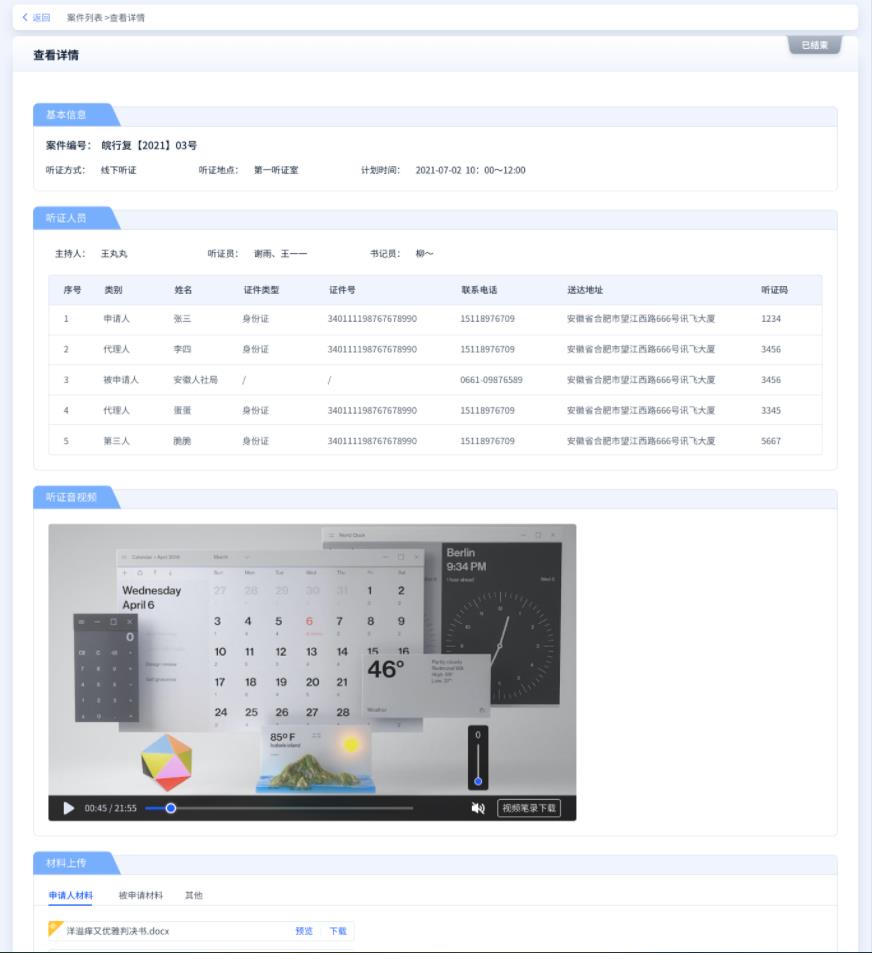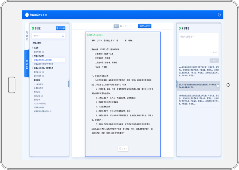 案件信息及卷宗由平台进行总体管控,并自动导入至听证室内,实现听证环节的无纸化办理,听证过程中出现的所有音视频、纸质形式材料,也可以导入至平台,实现线上线下无纸化办公。