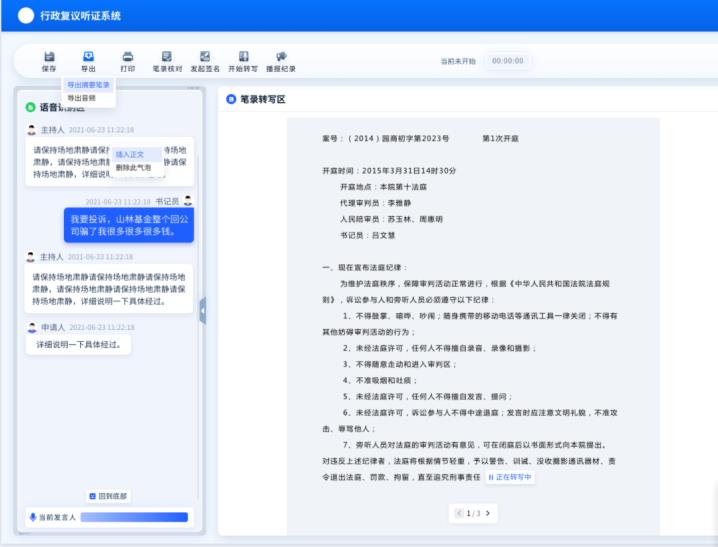 针对线下、远程的复议场景,实现对于听证全程的自动记录留痕,确保在听证、调节等环节中所有的信息都被记录在案,减少后续可能出现的应诉风险。